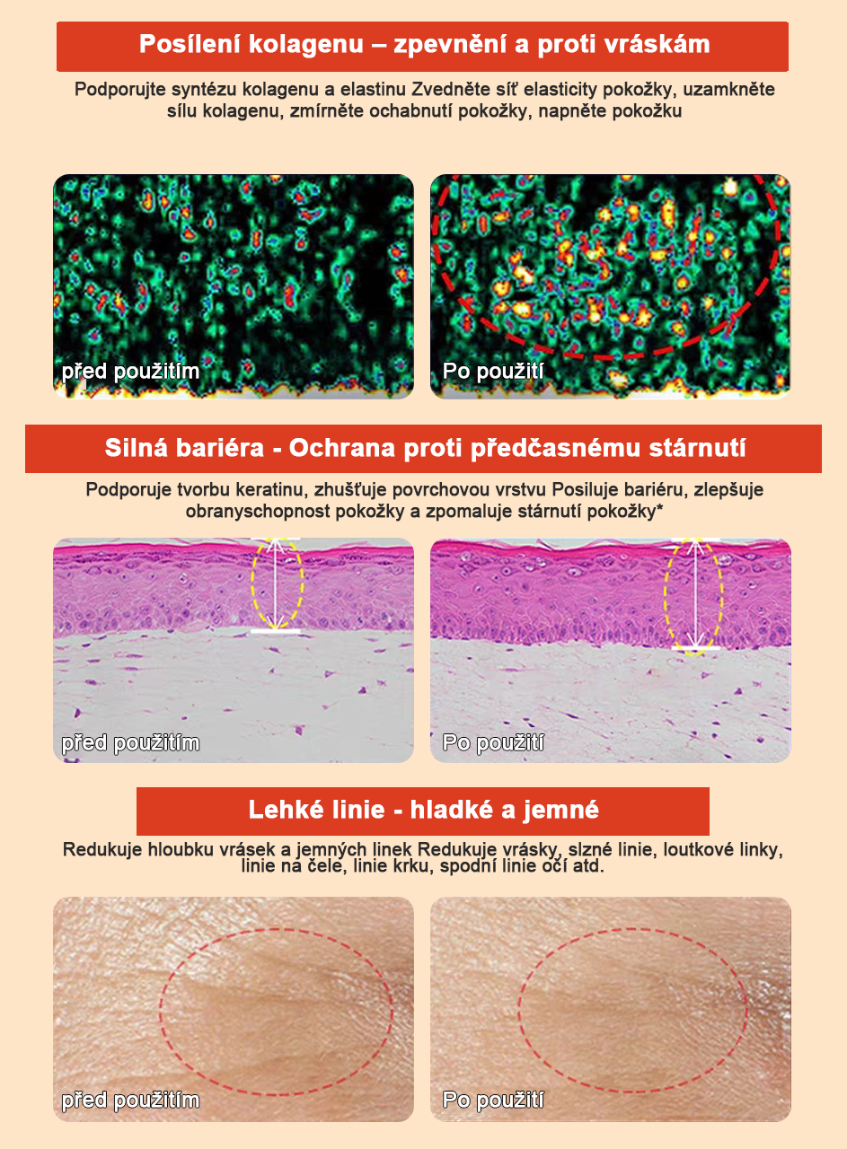 - Klinicky prokázané výsledky: redukce jemných linek a vrásek, zpevnění pleti a viditelné zlepšení výsledků.