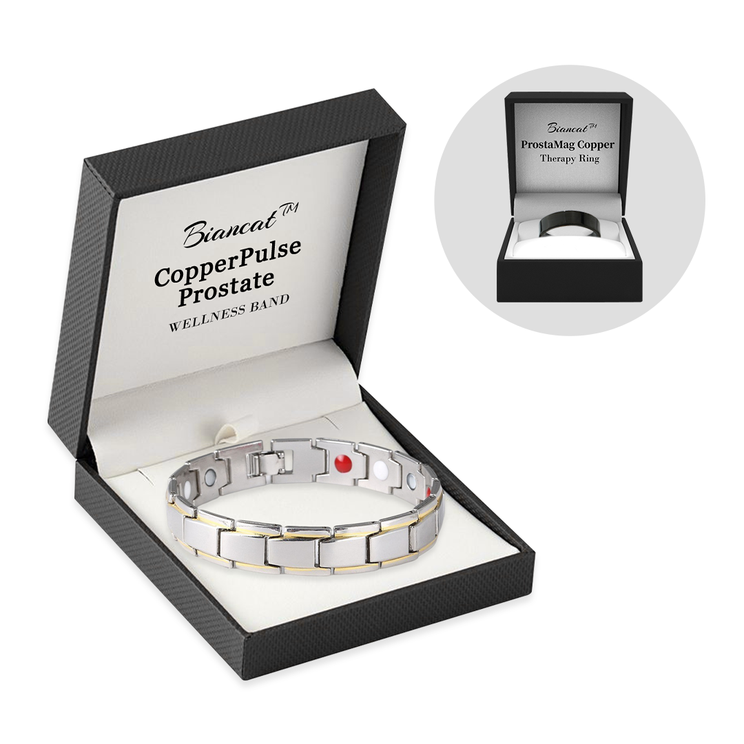 Náramek a kroužek Pásy a kroužky pro zdraví prostaty Biancat™ CooperPulse využívá kombinaci výhod mědi a magnetické terapie k podpoře zdraví prostaty. Měď i magnetická terapie mají dobře zdokumentované léčebné vlastnosti a jejich kombinace vytváří synergický efekt, který zlepšuje zdraví prostaty.